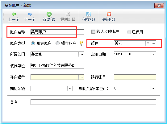 在新增資金賬戶窗口,錄入外幣賬戶名稱,并選擇幣種信息,然后錄入期初余額、期初余額(本位幣)等信息后保存資金賬戶。