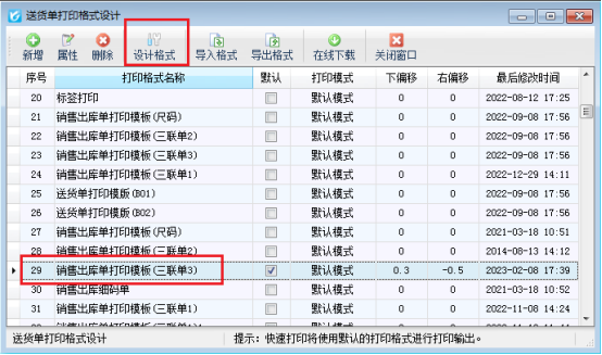 以送貨單軟件為例,選擇一個送貨單單據,選擇“打印”—》“打印格式設計”—》“設計格式”進入打印模板設計器頁面,如下圖所示: