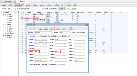 在功能導航窗點“基礎資料”—》“商品信息”即可進入“商品信息”界面,修改商品信息如圖所示,輸入擴展信息1和擴展信息2的內容進行保存。