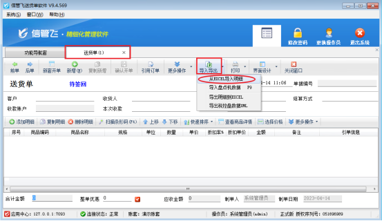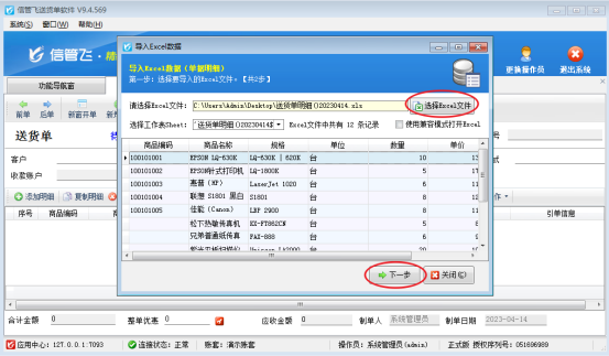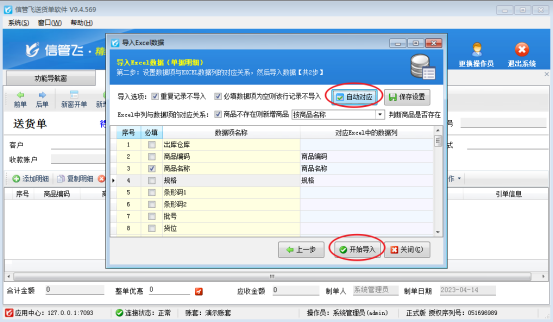 在功能導航欄業務處理--新開送貨單,點擊新開送貨單進入開單界面,工具欄“導入導出”按鈕下拉列表選擇“從EXCEL導入明細”,第一步:選擇要導入的excel文件點擊下一步,第二步:設置數據項與excel數據列的對應關系,點擊自動對應,沒有自動對應請手動設置對應關系,點擊開始導入,如圖所示: