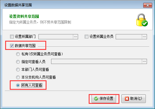 在設(shè)置數(shù)據(jù)共享范圍窗口,勾選“數(shù)據(jù)共享范圍”然后選擇需要設(shè)置的共享范圍,點(diǎn)擊“保存設(shè)置”按鈕保存設(shè)置即可,如下圖所示,設(shè)置數(shù)據(jù)共享范圍為“所有人可查看”。