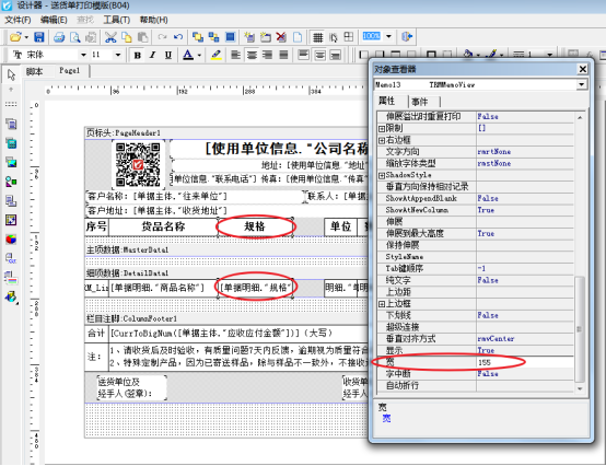 在模板設(shè)計(jì)器界面,選中規(guī)格文本框,右鍵屬性調(diào)整合適文本框?qū)挾龋ɑ蛘甙碨hift+左右箭頭可以微調(diào)寬度大小),如圖所示: