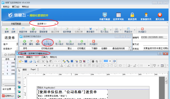 功能導(dǎo)航窗點(diǎn)擊“業(yè)務(wù)處理”—》“新開送貨單”,新增并保存一張送貨單單據(jù),工具欄“打印”下點(diǎn)擊“打印格式設(shè)計(jì)”,在打印格式設(shè)計(jì)界面選擇模板點(diǎn)擊“設(shè)計(jì)格式”進(jìn)入打印模板設(shè)計(jì)器界面,示例模板:送貨單打印模版(B02),如下圖所示: