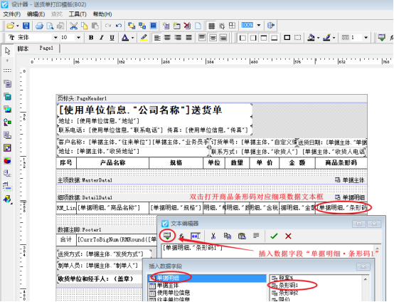 進(jìn)入模板設(shè)計(jì)器界面,選中商品條形碼對(duì)應(yīng)的細(xì)項(xiàng)數(shù)據(jù)文本框,雙擊該文本框插入數(shù)據(jù)字段“單據(jù)明細(xì)·條形碼1”,預(yù)覽不需要調(diào)整保存即可,如下圖所示: