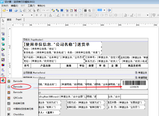 需要商品條形碼以條形碼形式顯示,在打印模板設(shè)計(jì)器界面點(diǎn)擊左側(cè)工具欄最下邊圖標(biāo),下拉列表點(diǎn)擊“Barcode”添加放置到商品條形碼位置,放置完成雙擊打開進(jìn)行配置調(diào)用參數(shù)和條碼類型,如下圖所示: