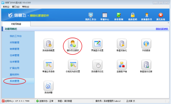 系統(tǒng)管理員賬號登錄軟件,在功能導(dǎo)航窗點擊“系統(tǒng)管理”—》“操作員及授權(quán)”即可進入到操作員管理及授權(quán)界面,如下圖所示: