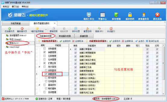 設(shè)置操作員權(quán)限:選中操作員“李拓”賬號,然后在功能模塊權(quán)限中勾選設(shè)置操作員銷售查詢功能(右側(cè)默認全部勾選,不需要的權(quán)限可取消勾選),點擊保存即可,如圖所示: