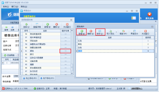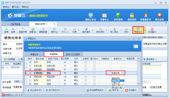 在功能導(dǎo)航欄點(diǎn)擊銷售管理---打開銷售出庫單,在開單界面點(diǎn)擊界面設(shè)計(jì),勾選擴(kuò)展信息并自定義列名為“顏色”,取值方式選擇“數(shù)據(jù)字典”,如圖所示: