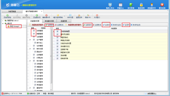 選中操作員賬號,設(shè)置操作員權(quán)限,權(quán)限可勾選進(jìn)行設(shè)置,也可直接點擊全選批量設(shè)置。