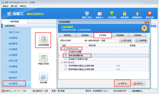 在功能導(dǎo)航窗點擊“系統(tǒng)管理”—》“系統(tǒng)參數(shù)配置”—》“業(yè)務(wù)參數(shù)”,業(yè)務(wù)單據(jù)相關(guān)參數(shù)下,打勾“啟用消息提醒功能”,保存設(shè)置,如下圖所示: