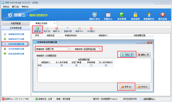 在功能導(dǎo)航窗點擊“系統(tǒng)管理”—》“單據(jù)業(yè)務(wù)參數(shù)”—》“審核消息提醒設(shè)置”,在此界面增加消息接收人員“張亞”及提醒范圍,如下圖所示: