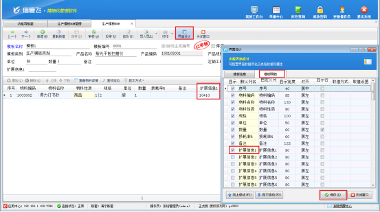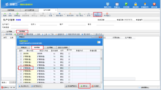 設置完成后,在功能導航窗點擊“生產管理”—》“生產計劃單”,工具欄點擊“界面設計”—》“用料明細”,將用料明細下的“擴展信息1”勾選顯示出來,如下圖所示。