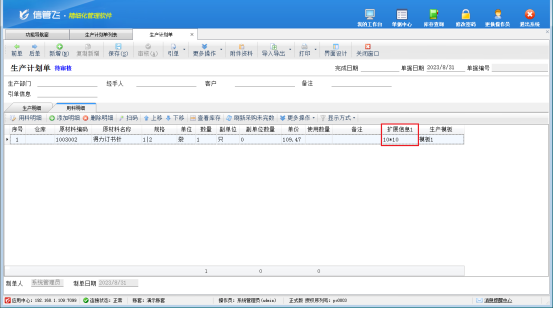 開單界面點生產明細添加需要生產的商品,該商品對應的生產模板自動調用,此時用料明細界面可以看到對應模板明細的擴展信息已經顯示出來了,如下圖所示。