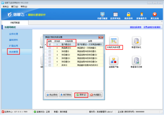 在功能導航窗點擊“系統(tǒng)管理”—“價格優(yōu)先級設(shè)置”,在價格優(yōu)先級設(shè)置中勾選啟用“客戶最近價”并向上移動到第一位,然后保存商品價格優(yōu)先級設(shè)置。如下圖所示: