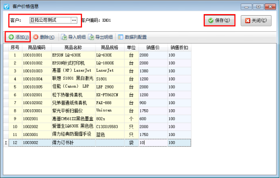 功能導航窗點擊“基礎(chǔ)資料”,打開“客戶價格信息”界面,點擊“新增”按鈕下的“按客戶添加價格信息”,彈出的客戶價格信息界面,先選擇客戶,然后點擊“添加明細”添加商品信息,輸入銷售價(支持導入操作),輸入完成點擊保存按鈕。如下圖所示: