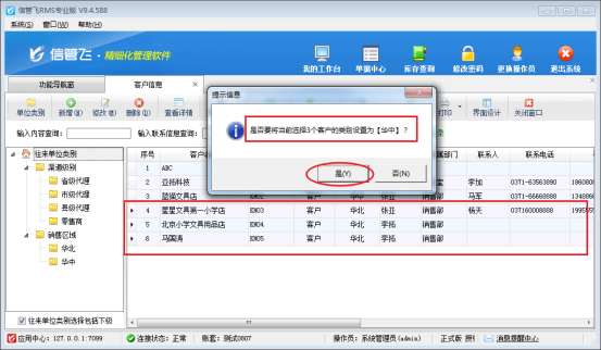 以上圖為例,單位類別是“華北”區(qū)域的一共有3條記錄,現(xiàn)在要把這3條記錄的單位類別改為“華中”區(qū)域。首先點(diǎn)擊第4行記錄,然后按下Shift鍵不松手時(shí)鼠標(biāo)點(diǎn)擊第6行記錄,這樣就可以同時(shí)快速選中第4行至第6行這3條記錄,選中多條記錄后,再按住鼠標(biāo)左鍵不松手,移動到單位類別“華中”區(qū)域處,此時(shí)系統(tǒng)會提示“是否要將當(dāng)前選擇3個(gè)客戶的類別設(shè)置為【華中】?”,點(diǎn)“是”按鈕即可,如圖所示。