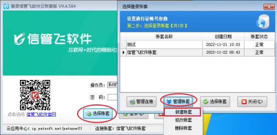 在客戶端登錄界面點擊“選擇賬套”——點擊“下一步”——賬套管理下拉列表中點擊“新建賬套”,如圖所示: