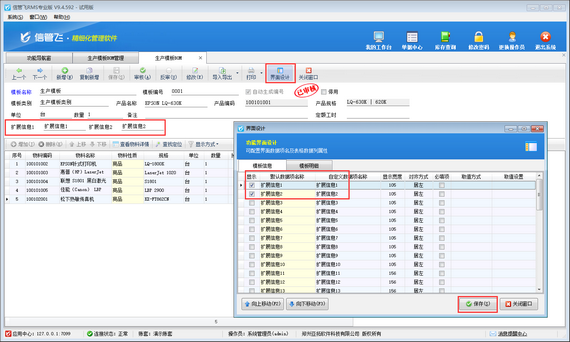 設(shè)置完成后,在功能導(dǎo)航窗點擊“生產(chǎn)管理”—》“生產(chǎn)模板BOM”打開生產(chǎn)模板Bom管理界面,新增生產(chǎn)模板,在打開的生產(chǎn)模板界面工具欄點擊“界面設(shè)計”—》“模板信息”,可將“擴展信息1、擴展信息2”勾選顯示出來并錄入相應(yīng)內(nèi)容,如下圖所示。