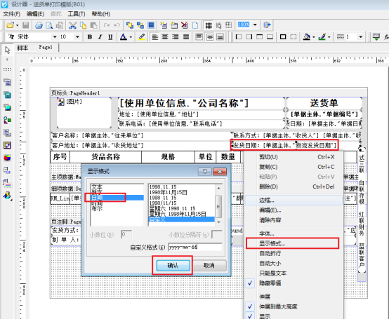 調(diào)用數(shù)據(jù)完成后,選中發(fā)貨日期文本框,右鍵可設(shè)置日期格式,可選擇已存在的日期格式或者自定義日期格式,如圖所示: