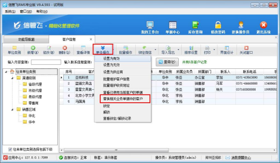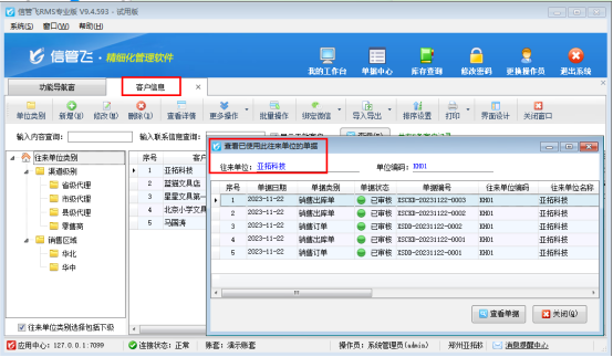 在功能導航窗點擊基礎資料打開客戶信息界面,選擇客戶“亞拓科技”在更多操作下點擊“查看已使用當前客戶的單據”,可以查看此客戶已開單,如下圖所示: