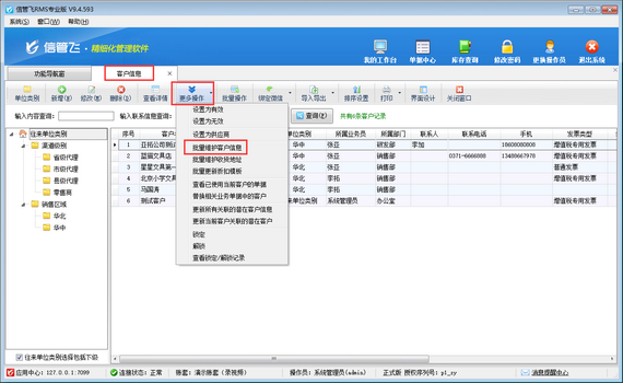 在功能導(dǎo)航窗點擊“基礎(chǔ)資料”—》“客戶信息”,在客戶信息界面工具欄點擊“更多操作”下的“批量維護客戶信息”進入批量維護客戶信息界面,如下圖所示: