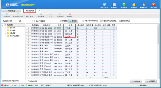 參數(shù)設(shè)置完成后,退出重新登錄軟件,此時(shí)倉(cāng)庫(kù)管理右側(cè)查詢統(tǒng)計(jì)處已顯示庫(kù)存分倉(cāng)明細(xì)查詢。