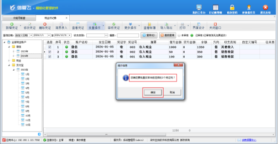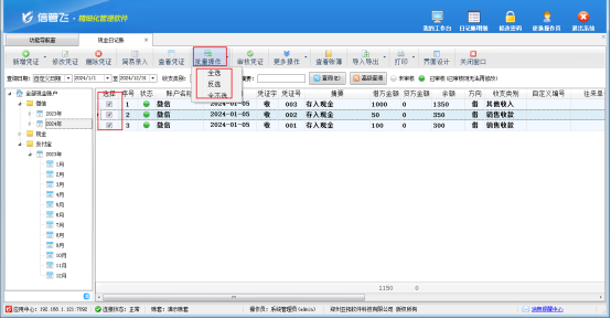 信管飛出納記賬軟件是一款集現(xiàn)金/銀行日記賬、應(yīng)收應(yīng)付款管理、工資管理、發(fā)票管理等為一體的綜合性財(cái)務(wù)出納管理軟件,軟件默認(rèn)日記賬憑證審核后,不允許直接修改,有用戶在審核之后需要修改憑證,已審核狀態(tài)下無(wú)法進(jìn)行修改,需要先反審憑證才能修改,如果需要修改的憑證過(guò)多,一個(gè)一個(gè)進(jìn)行反審比較麻煩,為了提高效率,軟件內(nèi)支持批量反審憑證,本文以“信管飛出納記賬軟件”為例進(jìn)行示范。