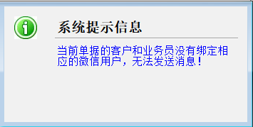 信管飛RMS、信管飛出納記賬軟件、信管飛送貨單軟件均支持微信消息增值服務(wù)功能,部分用戶在開單保存單據(jù)時(shí)會(huì)出現(xiàn)以下提示:“當(dāng)前單據(jù)的客戶和業(yè)務(wù)員沒有綁定相應(yīng)的微信用戶,無法發(fā)送”,如圖: