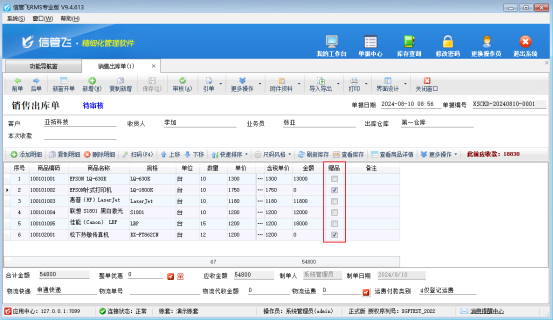 新開一張銷售單,勾選贈(zèng)品,如圖所示: