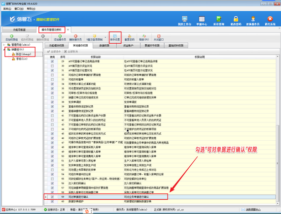 解決方法如下:使用系統管理員賬號登錄軟件,在功能導航窗點擊“系統管理”—》“操作員及授權”打開操作員管理及授權界面,選擇操作員賬號,在“其他操作權限”界面將“可對單據確認”權限勾選上,然后保存權限設置,如下圖所示。