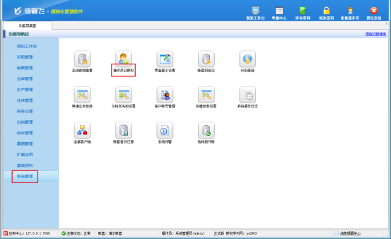 在功能導航窗點擊“系統管理”—》“操作員及授權”打開操作員管理及授權界面,選擇操作員“張亞”,然后在其右側的功能模塊權限內找到“統計查詢”下的“庫存查詢”,將“庫存查詢”勾選取消,然后保存權限設置,如下圖所示。