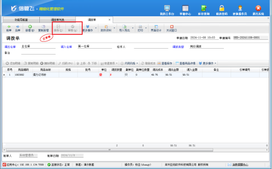 操作員權(quán)限設(shè)置完成后,切換操作員“張亞”登錄軟件,在功能導航窗點擊“倉庫管理”—》“調(diào)撥單”打開調(diào)撥單列表,查看調(diào)撥單,可以看到操作員賬號已沒有反審修改權(quán)限,如下圖所示。
