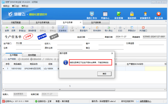 信管飛RMS軟件標準版及專業版支持擴展功能模塊。擴展生產管理模塊后,生產任務單被引用開單生產領料單,客戶咨詢領料期間發現部分庫存無貨,只能更改任務單,在更改部分領料狀態的生產任務單時提示“當前任務單已下達生產領料出庫單,不能反審修改”,如何解決?提示如下圖所示: