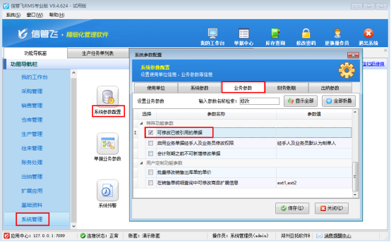允許反審修改,需啟用下參數,在系統管理-系統參數配置中選擇“業務參數”,啟用參數“可修改已被引用的單據”,保存參數配置,如下圖所示:
