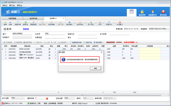 出現(xiàn)以上問(wèn)題的原因是:當(dāng)前登錄的操作員賬號(hào)沒(méi)有可發(fā)送微信消息的權(quán)限。