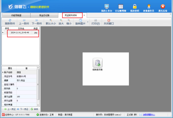 信管飛出納記賬軟件在新增或修改憑證時,允許用戶添加文檔、圖表等豐富的附件資料,支持掃描或直接導入與出納憑證相關的電子文件。這一功能極大地方便了用戶全面、直觀地回溯和查詢日記賬憑證的詳細信息,有效提升了企業對日記賬憑證的管理效率。當用戶需要在日記賬列表界面快速查看某一憑證的附件時,信管飛出納記賬軟件提供了直接在列表中打開附件資料的便捷功能。本文以“信管飛出納記賬軟件”為例介紹一下如何在日記賬列表界面輕松查看憑證附件?