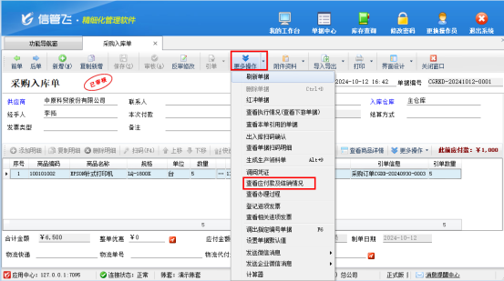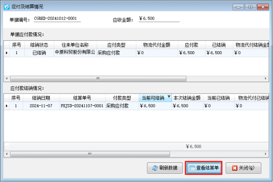 已結(jié)銷應(yīng)付款的單據(jù)需要反審修改,需變?yōu)椤拔唇Y(jié)銷”狀態(tài),快捷操作方式,在采購(gòu)入庫(kù)單界面點(diǎn)擊更多操作下的“查看應(yīng)付款及結(jié)銷情況”,彈出界面點(diǎn)擊“查看結(jié)算單”如下圖所示: