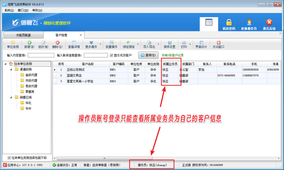 權限設置完成后,使用操作員賬號登錄軟件,在功能導航窗點擊“基礎資料”—》“客戶信息”打開客戶信息界面,可看到操作員賬號只能查看到業務員為自己的客戶信息,如下圖所示。