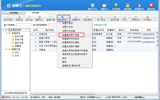 軟件界面設(shè)計(jì)簡(jiǎn)潔直觀,操作流程清晰易懂。用戶只需在功能導(dǎo)航窗點(diǎn)擊“基礎(chǔ)資料”—“客戶信息”,進(jìn)入客戶信息界面后,通過(guò)工具欄的“更多操作”選擇“批量維護(hù)客戶信息”,即可進(jìn)入批量維護(hù)界面。在這里,企業(yè)能夠快速進(jìn)入批量操作模式,輕松勾選需要設(shè)置所屬業(yè)務(wù)員的客戶信息,簡(jiǎn)單幾步即可完成批量設(shè)置,讓客戶信息管理變得輕松簡(jiǎn)單。