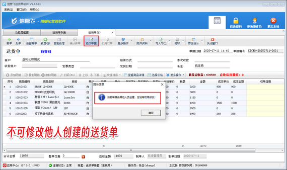 有用戶操作員賬號(hào)登錄軟件在修改送貨單時(shí),無(wú)法修改送貨單,提示:“當(dāng)前單據(jù)由其他人員創(chuàng)建,您沒(méi)有權(quán)限修改!”如下圖所示。