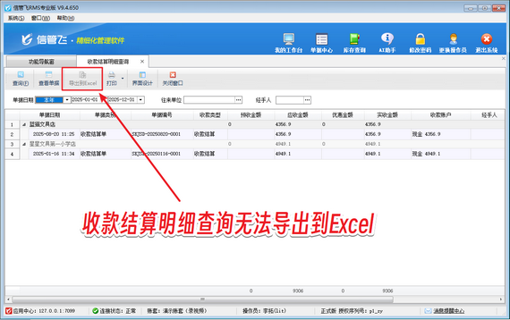 收款結算單用來登記收款信息(收款對象即客戶、收款賬戶、收款金額、經手人等),并結銷應收款記錄。另外系統也支持收款結算明細查詢匯總表,有用戶操作員賬號登錄軟件無法導出收款結算明細查詢匯總數據,如下圖所示。