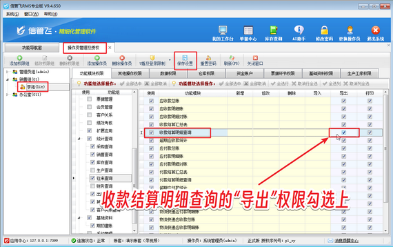 解決方法如下:在功能導航窗點擊“系統管理”—》“操作員及授權”打開操作員管理及授權界面,選擇操作員賬號“李拓”,然后在其右側的功能模塊權限內選擇“往來查詢”,將收款結算明細查詢的“導出”權限勾選上,然后保存權限設置,如下圖所示。