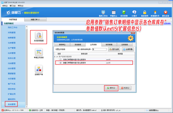 在功能導(dǎo)航窗點(diǎn)擊“系統(tǒng)管理”—》“系統(tǒng)參數(shù)配置”—》“業(yè)務(wù)參數(shù)”打開業(yè)務(wù)參數(shù)配置界面,在“用戶定制功能參數(shù)”內(nèi)啟用參數(shù)“銷售訂單明細(xì)中顯示各倉庫庫存”,并設(shè)置參數(shù)值,默認(rèn)是“ext15”(擴(kuò)展信息15)。