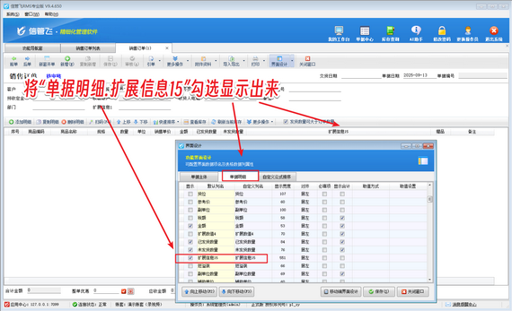 參數(shù)設(shè)置好之后,在功能導(dǎo)航窗點(diǎn)擊“銷售管理”—》“銷售訂單”,打開銷售訂單列表界面,新增銷售訂單,在打開的銷售訂單界面工具欄點(diǎn)擊界面設(shè)計(jì),在界面設(shè)計(jì)內(nèi)將“單據(jù)明細(xì).擴(kuò)展信息15”勾選顯示出來,如下圖所示。