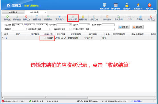 選擇應收款并進行結算:在應收款列表中,選擇一條未結銷的應收款,點擊工具欄的“收款結算”按鈕,系統將迅速彈出收款結算單界面。