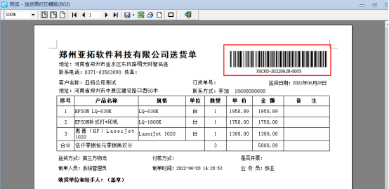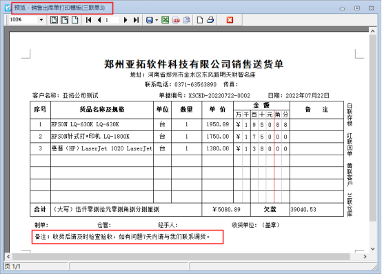 信管飛系列軟件都支持自定義設(shè)計打印模板,打印模板如果前期設(shè)計的時候沒有添加備注內(nèi)容(例如:注意事項),后期需要再添加該如何操作?本文以“信管飛送貨單軟件”為例進行示范下。 新開送貨單確認(rèn)保存,默認(rèn)打印模板預(yù)覽界面如下圖: 需要添加備注內(nèi)容,在送貨單開單界