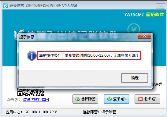 此文章演示視頻觀看鏈接:[InstallDir_ChannelDir]video/202301/1858.html 為了使用戶可以更好的管理公司賬套數(shù)據(jù),信管飛RMS、信管飛出納記賬軟件、信管飛倉庫管理軟件都支持設(shè)置操作員的登錄限制,系統(tǒng)管理員可以自定義設(shè)置操作員登錄軟件的時間,設(shè)置后,操作員在受限制