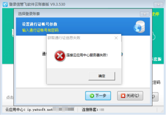 演示視頻觀看鏈接: 云賬套登錄提示“連接云應(yīng)用中心服務(wù)器失敗!”,如何解決演示視頻 部分用戶在登錄云賬套時可能會出現(xiàn)登錄不成功,彈出如下“連接云應(yīng)用中心服務(wù)器失敗!”的提示: 出現(xiàn)此種提示一般是