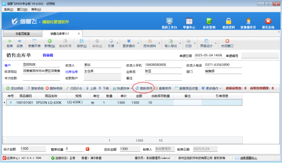 信管飛用戶在銷售出庫單界面中,選擇需要出庫的商品,并檢查其庫存數量是否已更新為最新值,可點擊刷新庫存操作,遇到出庫單界面沒有刷新庫存按鈕該如何處理?      在功能導航欄點擊“銷售管理”---銷售出庫單,打開銷售出庫單界面,在該界面點擊“界面設計”按鈕,在單據明細項勾選參數“當前庫存數量”,點擊保