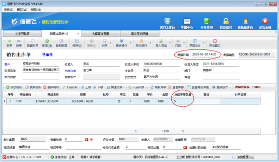 用戶在使用進銷存軟件過程中,遇到在銷售出庫單界面點擊刷新庫存按鈕,當前庫存數(shù)量未更新為該商品的當前實際庫存數(shù)量,是什么原因呢,該如何解決? 例如商品名稱“EPSON LQ-630K”,倉庫庫存數(shù)量是5個,出庫單開單界面點擊刷新庫存當前庫存數(shù)量是0,經(jīng)檢查發(fā)現(xiàn)原因是該商品入庫單發(fā)生時間是5月30日14點